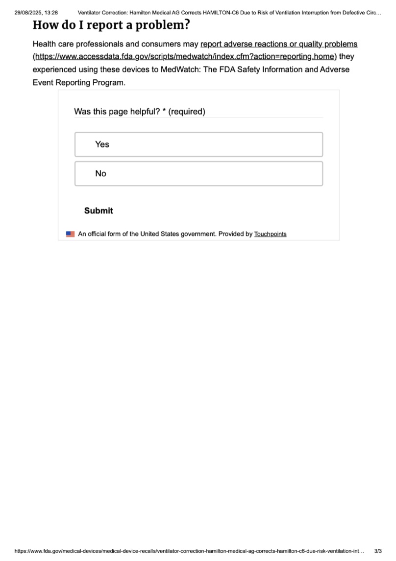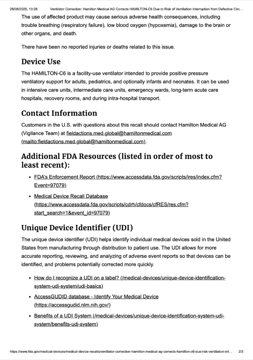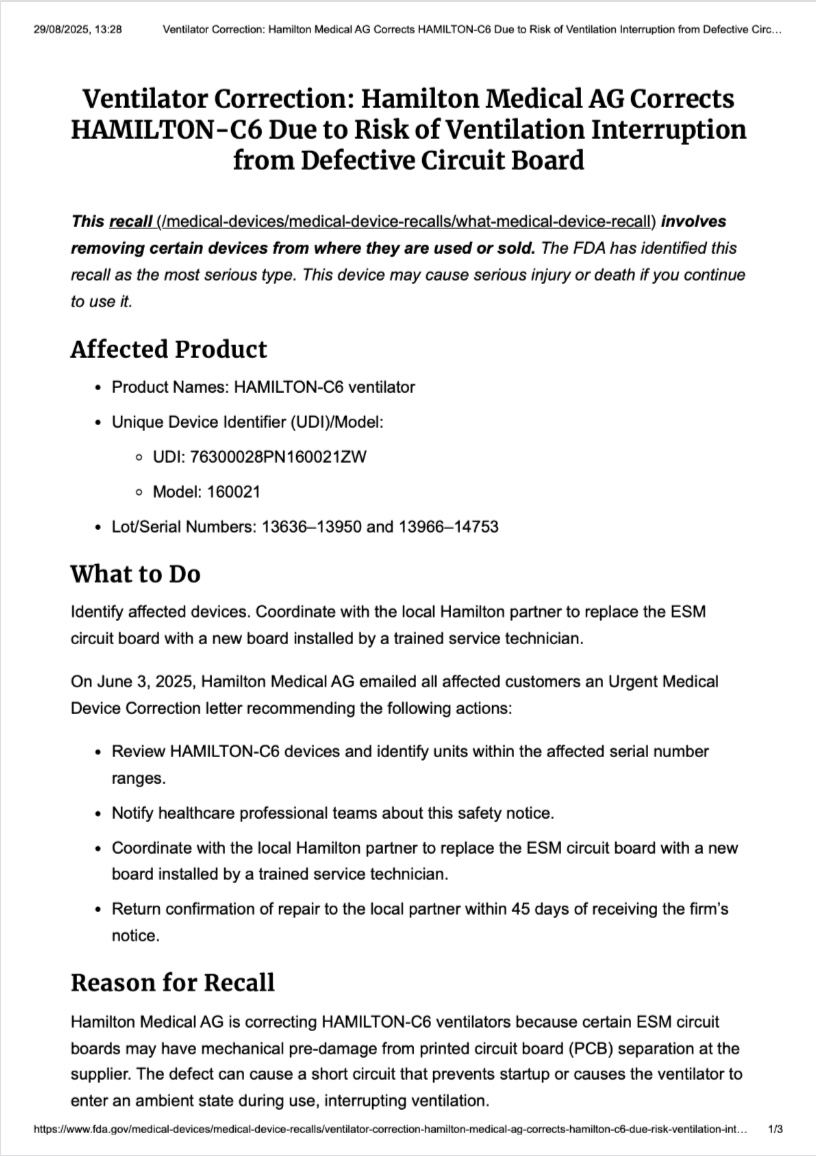 Recall, Ventilator Correction: Hamilton Medical AG Corrects HAMILTON-C6 Due to Risk of Ventilation Interruption from Defective Circuit Board